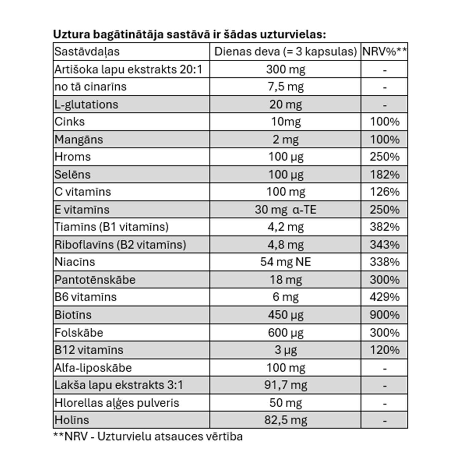 Artišoka (Cynara scolymus) lapu ekstrakts 20:1,apjoma palielinātājs hidroksipropilmetilceluloze (kapsulas apvalks), holīna bitartrāts, maltodekstrīns, C vitamīns(nātrija L-askorbāts),alfa-liposkābe, lakša (Allium ursinum) ekstrakts 3:1, cinka glikonāts, E vitamīns (D-alfa-tokoferilacetāts), niacīns (nikotīnamīds), hlorellas aļģes (Chlorella vulgaris) pulveris, L-glutations, pantotēnskābe (kalcija D-pantotenāts), mangāna glikonāts,vidējo ķēžu triglicerīdi no augu eļļas(no palmu augļu eļļas (Elaeis guineensis L.)), B6 vitamīns (piridoksīna hidrohlorīds), B1 vitamīns (tiamīna hidrohlorīds), B2 vitamīns (riboflavīns), krāsviela hlorofilu un hlorofilīnu vara kompleksi, folskābe (pteroilmonoglutamīnskābe), hroma III hlorīds, biotīns (D-biotīns), nātrija selenāts, B 12 vitamīns (ciānkobalamīns).
