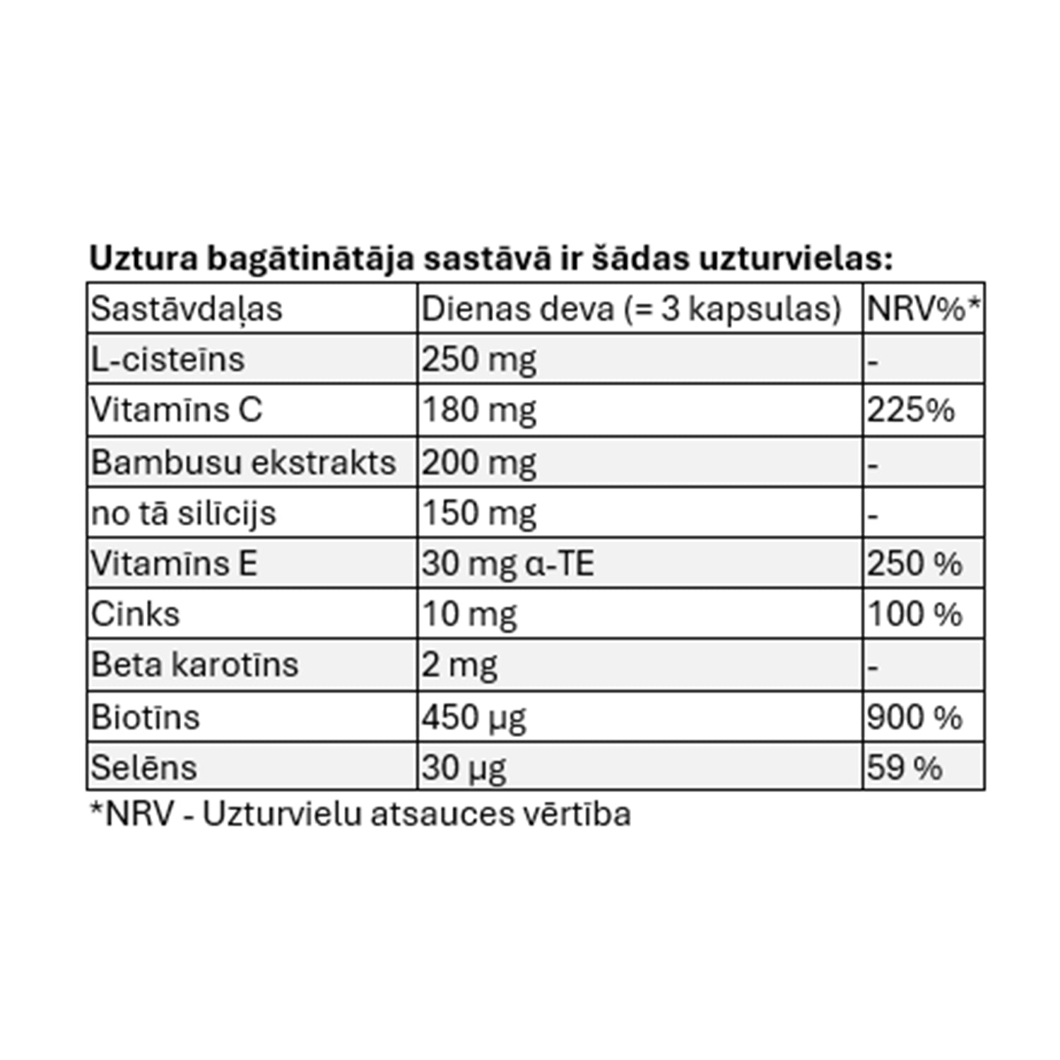 L-cisteīna hidrohlorīds, apjoma palielinātājs hidroksipro-pilmetilceluloze (kapsulas apvalks), C vitamīns (nātrija L-askorbāts), bambusu stublāju ekstrakts, kas standartizēts pēc silīcija daudzuma, zirņu šķiedrviela, cinka glikonāts, E vitamīns (DL-alfa-tokoferilacetāts), maltodekstrīns, vidējo ķēžu triglicerīdi no augu eļļas (no palmu augļu eļļas (Elaeis guineensis L.)), beta karotīns, krāsviela hlorofilīnu vara kompleksi, biotīns (D-biotīns), nātrija selenāts.