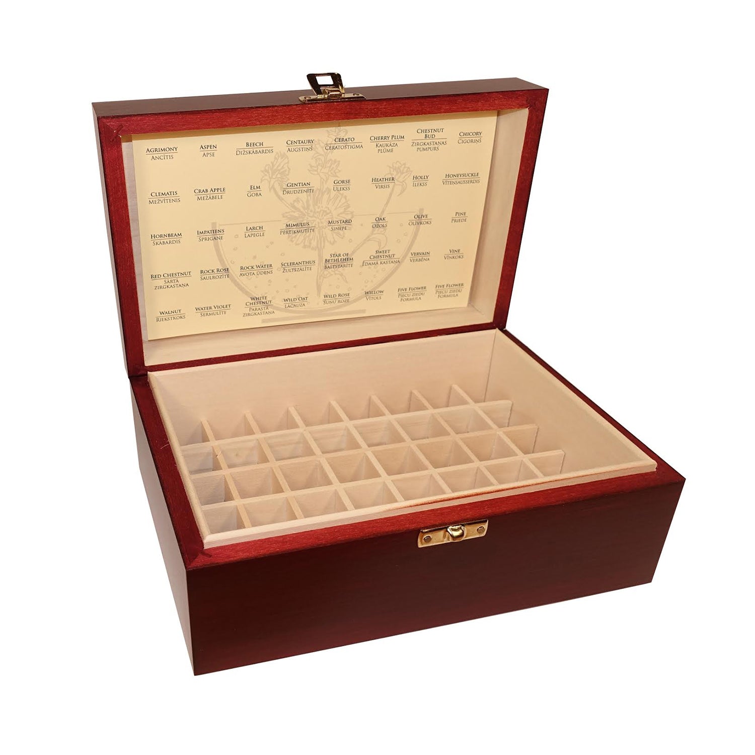 Uzglabāšanai un lietošanai ērta ir tieši Healing Herbs esenču pudelītēm izgatavotā koka kaste. Baha ziedu esences jāuzglabā vertikāli, tumšā, vēsā vietā, tāpēc šajā kastē Baha ziedi būs drošībā gan ikdienā, gan ņemot tos līdzi ceļojumos. Klāt pievienotais saraksts (tagad arī angļu un latviešu valodā!) katrai Baha ziedu esencei kastē ierāda savu vietu, kas Baha ziedu lietošanu padara vienkāršu un ērtu: visi Baha ziedu nosaukumi atrodas jūsu acu priekšā, un nav lieki jātērē laiks, meklējot vajadzīgās pudelītes.