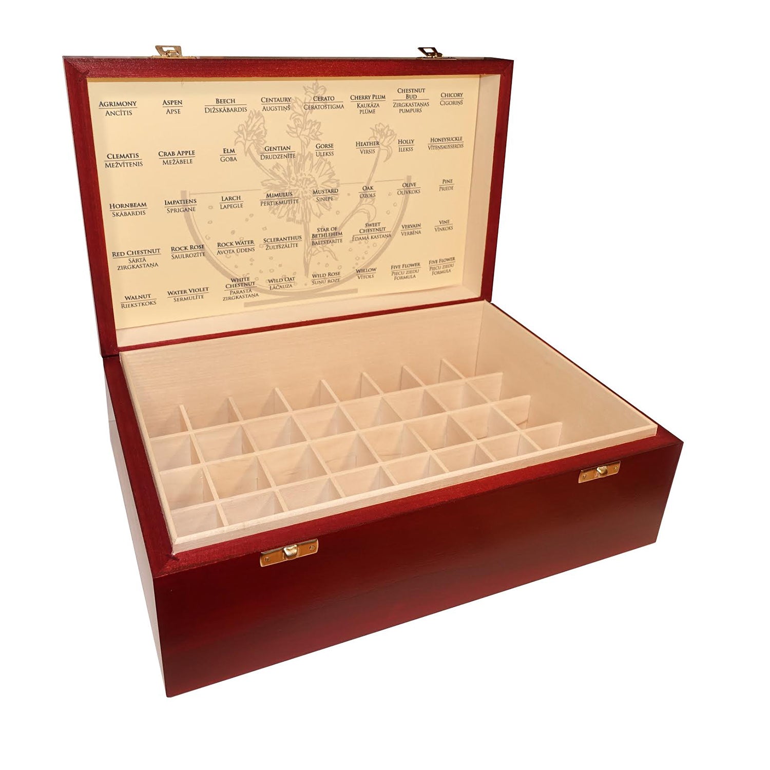 Uzglabāšanai un lietošanai ērta ir tieši Healing Herbs esenču pudelītēm izgatavotā koka kaste. Baha ziedu esences jāuzglabā vertikāli, tumšā, vēsā vietā, tāpēc šajā kastē Baha ziedi būs drošībā gan ikdienā, gan ņemot tos līdzi ceļojumos. Klāt pievienotais saraksts (tagad arī angļu un latviešu valodā!) katrai Baha ziedu esencei kastē ierāda savu vietu, kas Baha ziedu lietošanu padara vienkāršu un ērtu: visi Baha ziedu nosaukumi atrodas jūsu acu priekšā, un nav lieki jātērē laiks, meklējot vajadzīgās pudelītes.